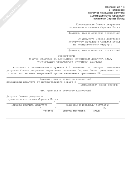 - 338Уведомление о даче согласия на назначение помощником депутата лица, исполняющего обязанности помощника депутата Совета депутатов городского поселения Сергиев Посад Московской области
