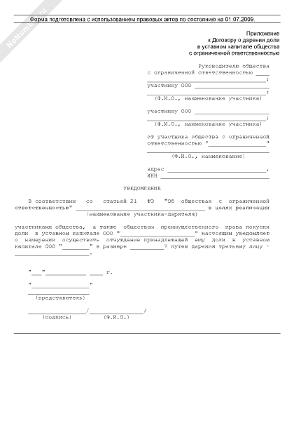 - 333Уведомление о дарении доли в уставном капитале общества с ограниченной ответственностью (приложение к договору о дарении доли в уставном капитале общества с ограниченной ответственностью)