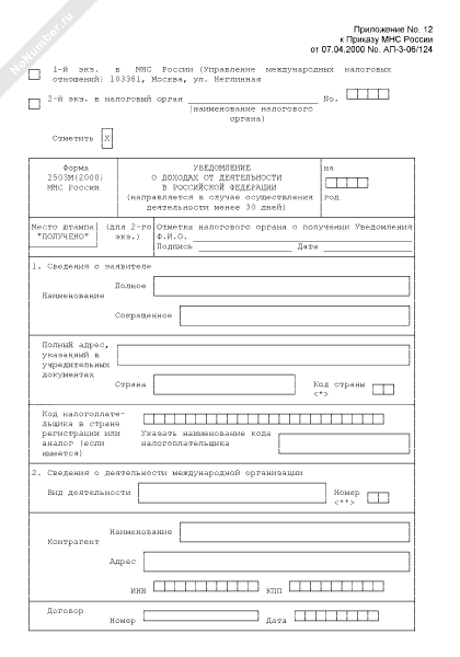 - 335Уведомление о доходах от деятельности международной организации в Российской Федерации. Форма № 2503М(2000)