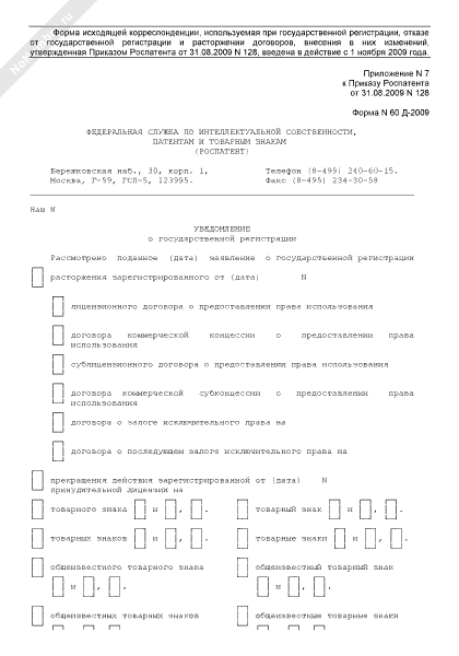 - 329Уведомление о государственной регистрации расторжения зарегистрированного договора в Федеральной службе по интеллектуальной собственности, патентам и товарным знакам. Форма № 60 Д-2009
