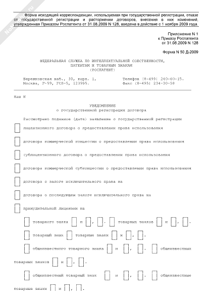 - 326Уведомление о государственной регистрации договора в Федеральной службе по интеллектуальной собственности, патентам и товарным знакам. Форма № 50 Д-2009
