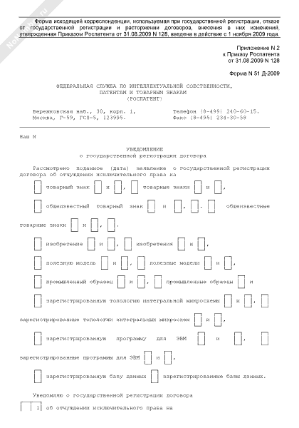 - 327Уведомление о государственной регистрации договора об отчуждении исключительного права в Федеральной службе по интеллектуальной собственности, патентам и товарным знакам. Форма № 51 Д-2009