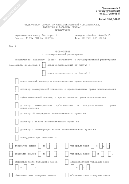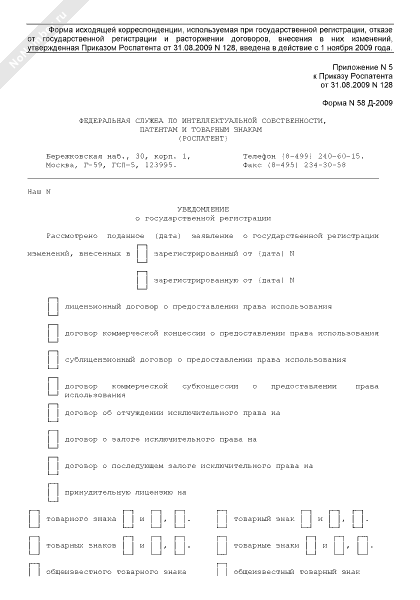 - 328Уведомление о государственной регистрации изменений, внесенных в договор, в Федеральной службе по интеллектуальной собственности, патентам и товарным знакам. Форма № 58 Д-2009