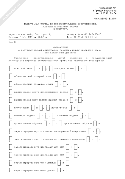 - 330Уведомление о государственной регистрации перехода исключительного права без заключения договора. Форма № 621 Е-2010