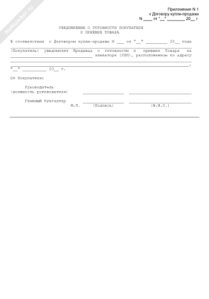- 331Уведомление о готовности покупателя к приемке товара (приложение к договору купли-продажи между победителем Биржевых торгов при проведении государственных товарных интервенций для регулирования рынка сельскохозяйственной продукции, сырья и продовольствия на ЗАО «Национальная товарная биржа» и агентом)