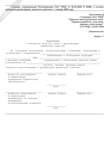 - 323Уведомление о готовности средства железнодорожной связи к предъявлению приемочной комиссии (форма № 11)
