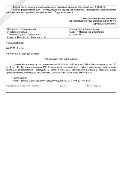 - 346Уведомление о даче согласия на направление трудовой книжки по почте