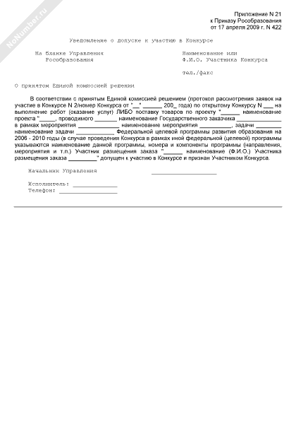 - 345Уведомление о допуске к участию в конкурсе на выполнение работ (оказание услуг) по проекту, проводимому в рамках реализации федеральных целевых, государственных и иных программ в сфере образования, воспитания и развития общедоступных образовательных ресурсов