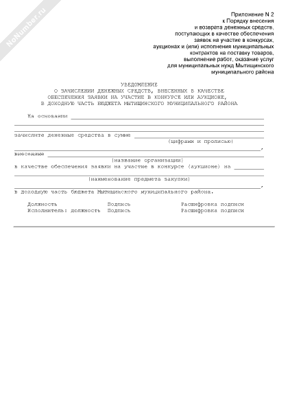 - 358Уведомление о зачислении денежных средств, внесенных в качестве обеспечения заявки на участие в конкурсе или аукционе, в доходную часть бюджета Мытищинского муниципального района
