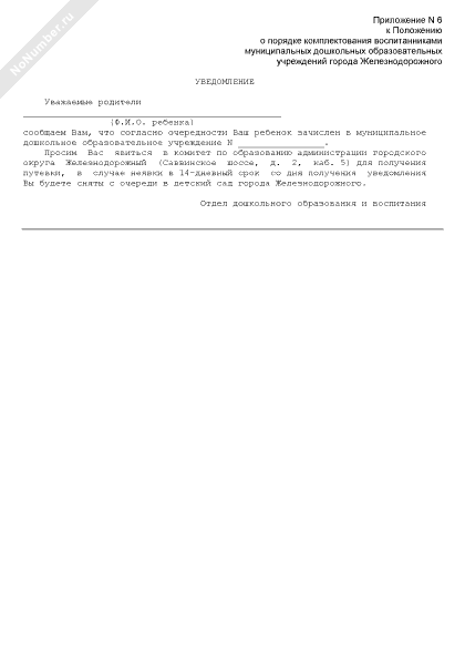 - 354Уведомление о зачислении ребенка в муниципальное дошкольное образовательное учреждение города Железнодорожного Московской области