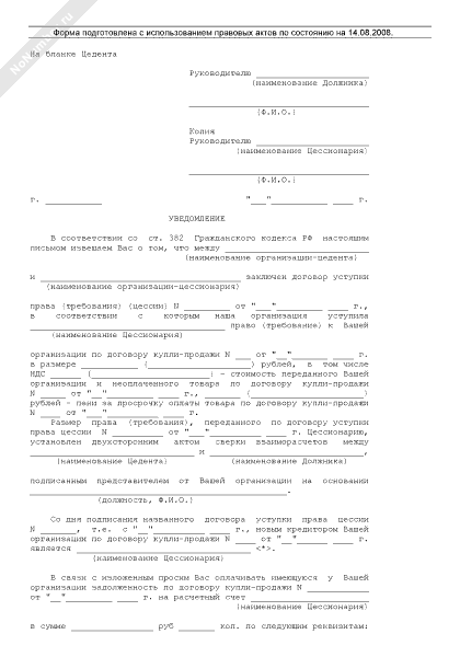 - 350Уведомление о заключении договора уступки права (цессии) по договору купли-продажи