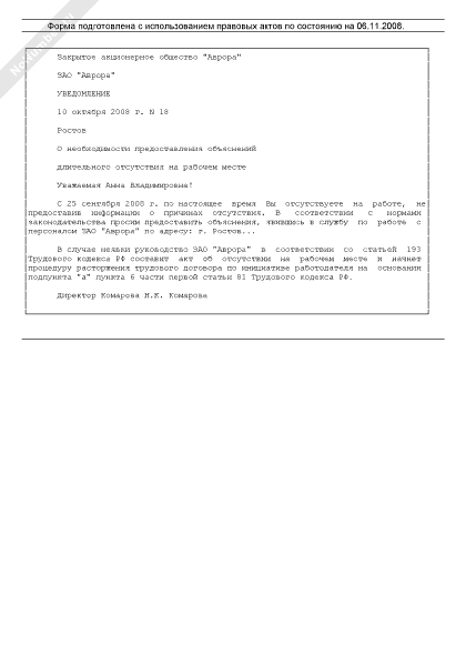 - 419Уведомление о необходимости предоставления объяснений длительного отсутствия на рабочем месте