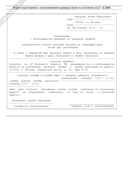 - 420Уведомление о необходимости прибытия за трудовой книжкой (направляется почтой заказным письмом на следующий день после дня увольнения)