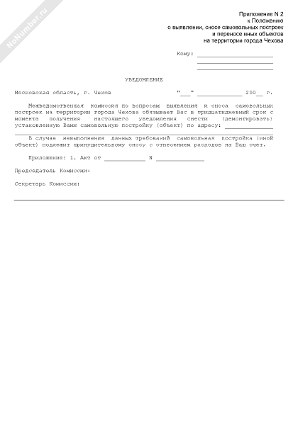 - 417Уведомление о необходимости сноса самовольной постройки (объекта) на территории городского поселения Чехов Московской области