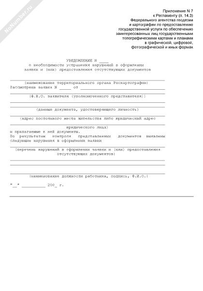 - 411Уведомление о необходимости устранения нарушений в оформлении заявки о предоставлении государственных топографических карт и планов в графической, цифровой, фотографической и иных формах и (или) предоставления отсутствующих документов