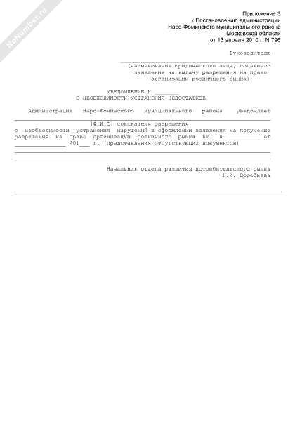 - 441Уведомление о необходимости устранения недостатков в оформлении заявления на получение разрешения на право организации розничного рынка на территории Наро-Фоминского муниципального района Московской области