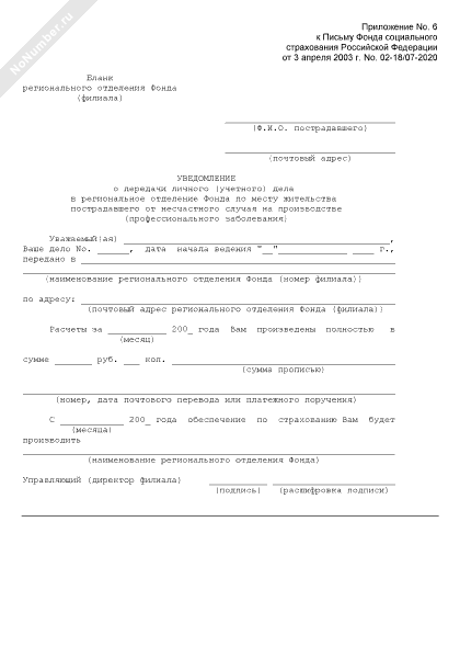 - 452Уведомление о передаче личного (учетного) дела в региональное отделение Фонда социального страхования по месту жительства пострадавшего от несчастного случая на производстве (профессионального заболевания)