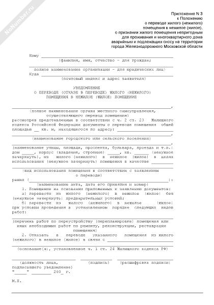 - 450Уведомление о переводе (отказе в переводе) жилого (нежилого) помещения в нежилое (жилое) помещение на территории г. Железнодорожного Московской области