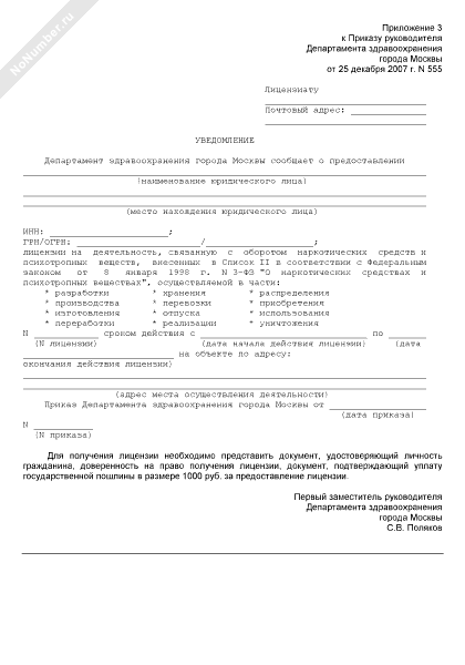 - 457Уведомление о предоставлении лицензии на деятельность, связанную с оборотом наркотических средств и психотропных веществ, внесенных в Список II в соответствии с Федеральным законом «О наркотических средствах и психотропных веществах» (для юридического лица)