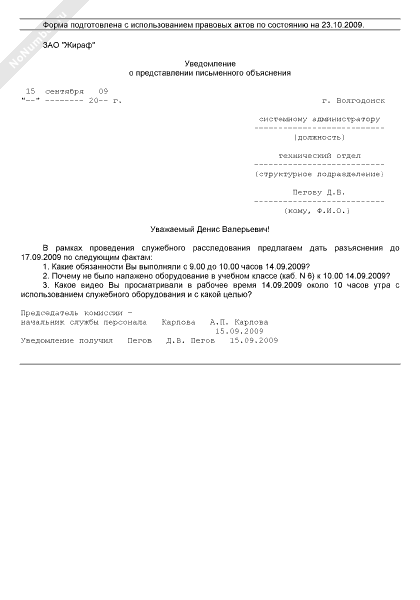 - 442Уведомление о представлении письменного объяснения по факту нарушения трудовой дисциплины