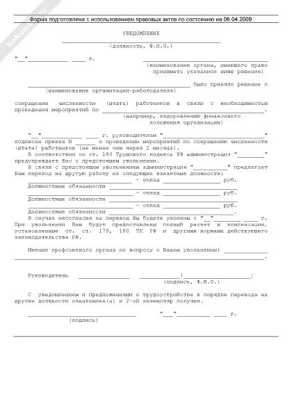 - 453Уведомление о предстоящем увольнении работника с предложениями о трудоустройстве в порядке перевода на другие должности