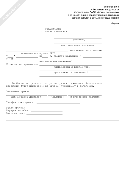 - 448Уведомление о приеме заявления на выдачу повторной справки о рождении на получение единовременной компенсационной выплаты на возмещение расходов в связи с рождением ребенка для предъявления в органы социальной защиты населения города Москвы