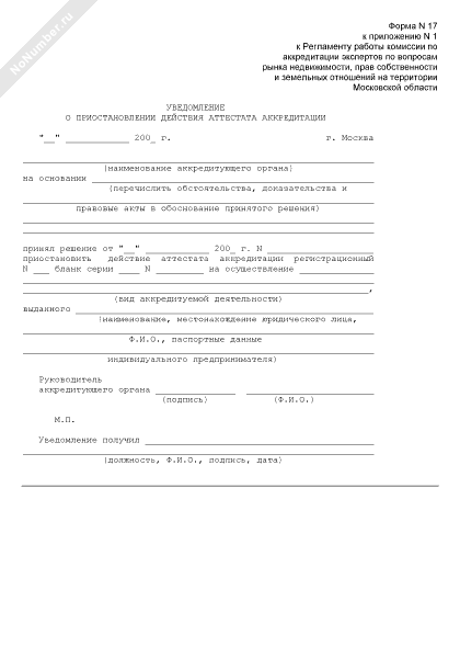 - 451Уведомление о приостановлении действия аттестата аккредитации экспертов по вопросам рынка недвижимости, прав собственности и земельных отношений на территории Московской области (форма № 17)