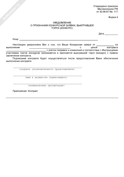 - 454Уведомление о признании конкурсной заявки, выигравшей торги (конкурс) на поставку товаров и услуг (форма № 4)