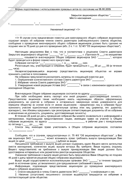 - 447Уведомление о проведении внеочередного собрания закрытого акционерного общества по вопросам определения количественного состава совета директоров, избрания членов совета директоров и утверждения новой редакции устава