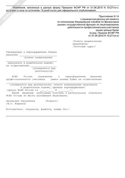 - 560Уведомление о переоформлении бланка лицензии профессионального участника рынка ценных бумаг лицензиату на осуществление деятельности