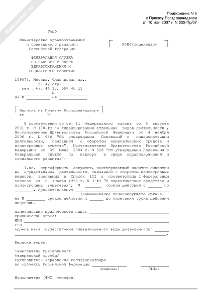 - 553Уведомление о переоформлении документа, подтверждающего наличие лицензии на осуществление деятельности, связанной с оборотом психотропных веществ, внесенных в Список III в соответствии с Федеральным законом от 8 января 1998 г. № 3-ФЗ «О наркотических средствах и психотропных веществах»