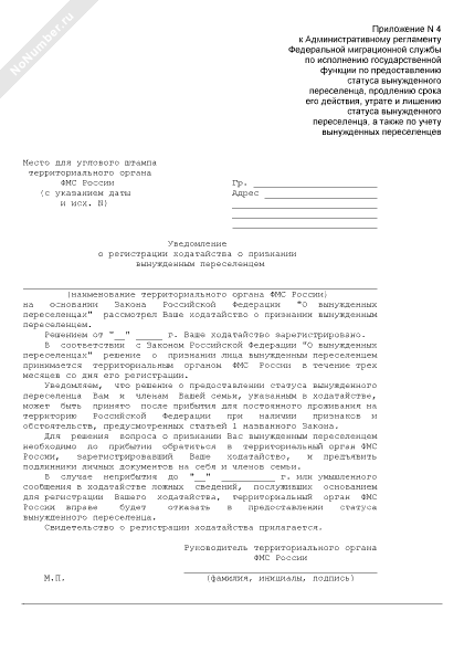 - 705Уведомление о регистрации ходатайства заявителя, подавшего ходатайство до оставления места жительства на территории иностранного государства, о признании вынужденным переселенцем в территориальном органе ФМС России