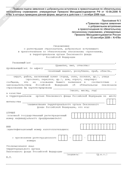 - 711Уведомление о регистрации страхователя, добровольно вступившего в правоотношения по обязательному пенсионному страхованию, в территориальном органе Пенсионного фонда Российской Федерации