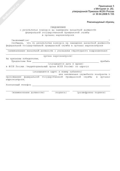 - 708Уведомление о результатах конкурса на замещение вакантной должности федеральной государственной гражданской службы в органах наркоконтроля (положительный результат)