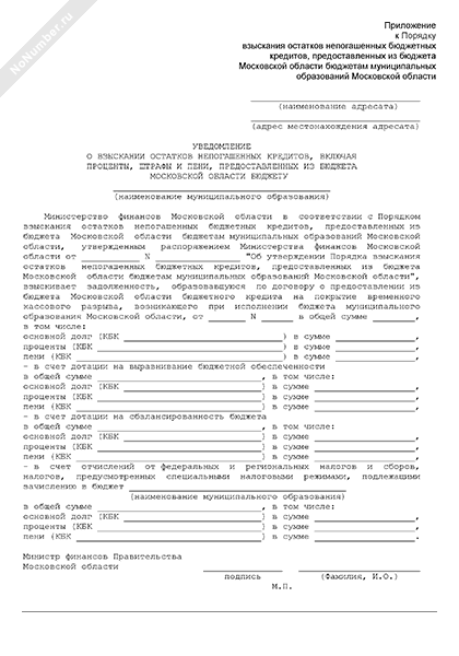 - 1261Уведомление о взыскании остатков непогашенных кредитов, включая проценты, штрафы и пени, предоставленных из бюджета Московской области бюджету муниципального образования