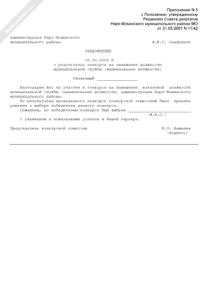 - 151Уведомление кандидата о результатах конкурса на замещение должности муниципальной службы в Наро-Фоминском муниципальном районе МО