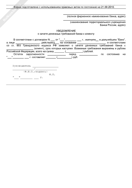 - 154Уведомление клиента о зачете денежных требований банка к клиенту