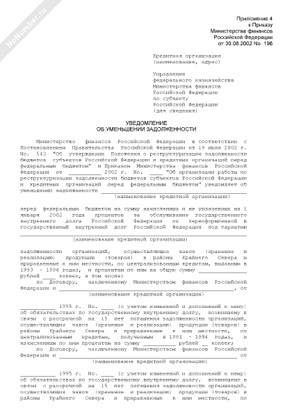 - 160Уведомление кредитной организации об уменьшении задолженности бюджета субъекта РФ перед федеральным бюджетом на сумму начисленных и не уплаченных на 1 января 2002 года процентов за обслуживание государственного внутреннего долга Российской Федерации по переоформленной в государственный внутренний долг Российской Федерации задолженности организаций, осуществляющих завоз (хранение и реализацию) продукции (товаров) в районы Крайнего Севера и приравненные к ним местности, по централизованным кредитам и процентам по ним