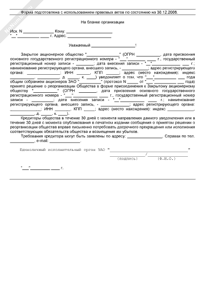 - 158Уведомление кредитору о принятии решения о реорганизации закрытого акционерного общества в форме присоединения