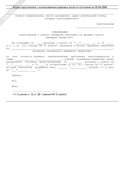 - 141Уведомление залогодателю о начале обращения взыскания на предмет залога (движимое имущество)