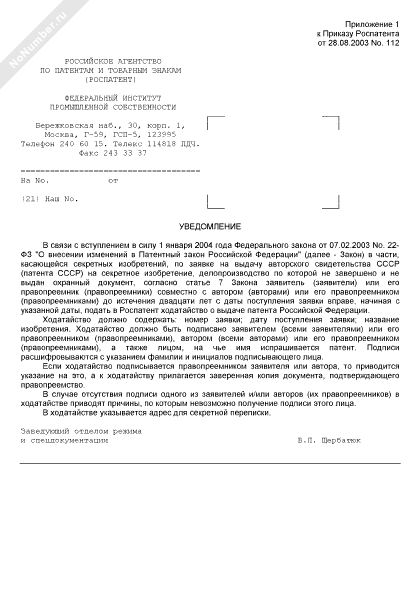 - 142Уведомление заявителя на выдачу авторского свидетельства СССР (патента СССР) на секретные изобретения, делопроизводство по которому не завершено и не выдан охранный документ