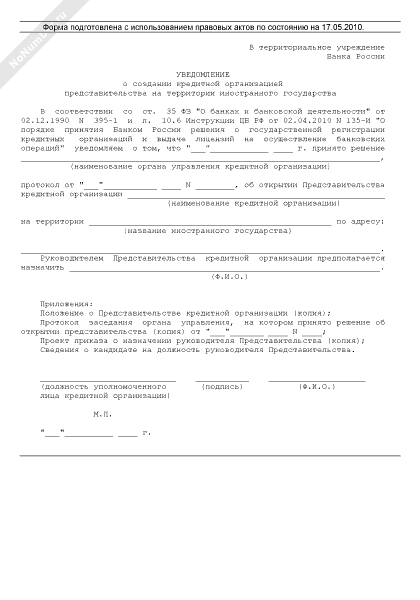 Уведомление Банка России о создании кредитной организацией представительства на территории иностранного государства (рекомендуемый образец заполнения)