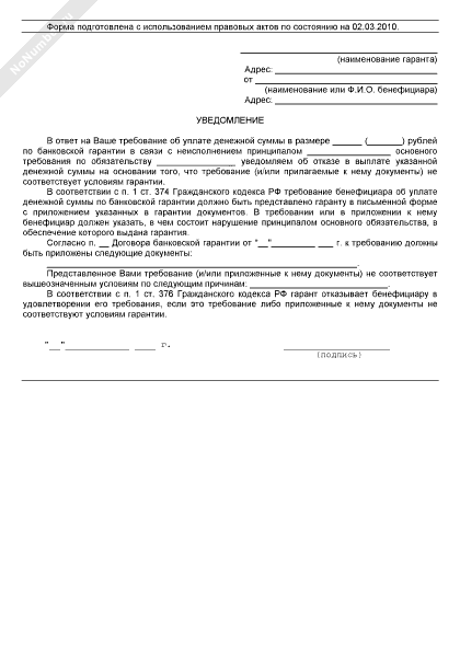 Уведомление гаранта об отказе от удовлетворения требований бенефициара в связи с тем, что требование либо приложенные к нему документы не соответствуют условиям гарантии (рекомендуемый образец заполнения)