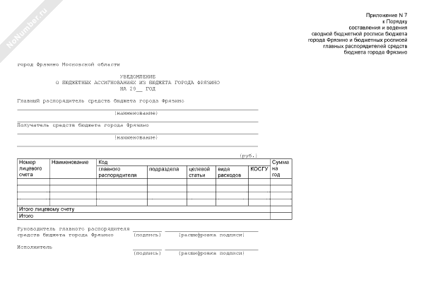 Уведомление главного распорядителя средств бюджета города Фрязино Московской области о бюджетных ассигнованиях из бюджета города (рекомендуемый образец заполнения)
