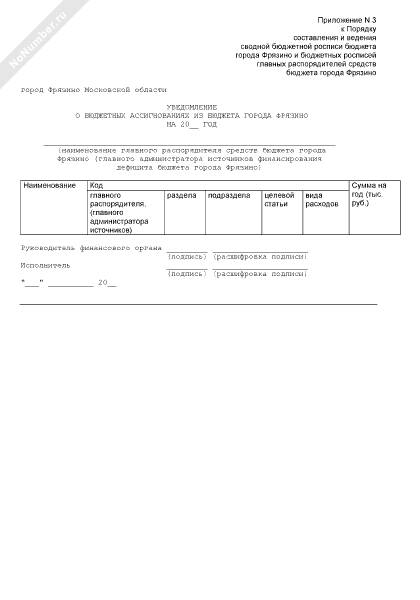 Уведомление главного распорядителя средств бюджета города Фрязино Московской области (главного администратора источников финансирования дефицита бюджета города Фрязино) о бюджетных ассигнованиях из бюджета города