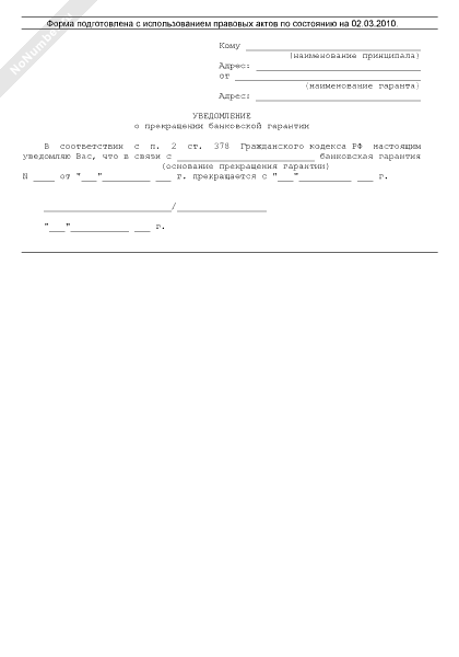 Уведомление гарантом принципала о прекращении банковской гарантии
