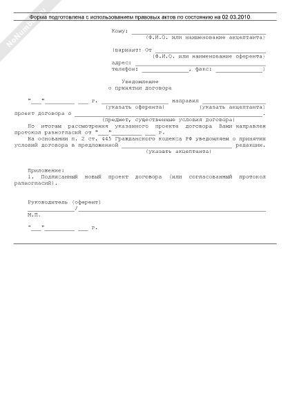 Уведомление о принятии договора в редакции другой стороны (общая форма)