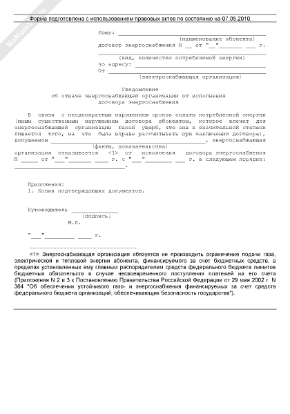 Уведомление об отказе энергоснабжающей организации от исполнения договора энергоснабжения (рекомендуемый образец заполнения)