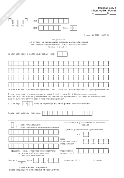 Уведомление об отказе от применения системы налогообложения для сельскохозяйственных товаропроизводителей. Форма № 26.1-3 (рекомендуемый образец заполнения)