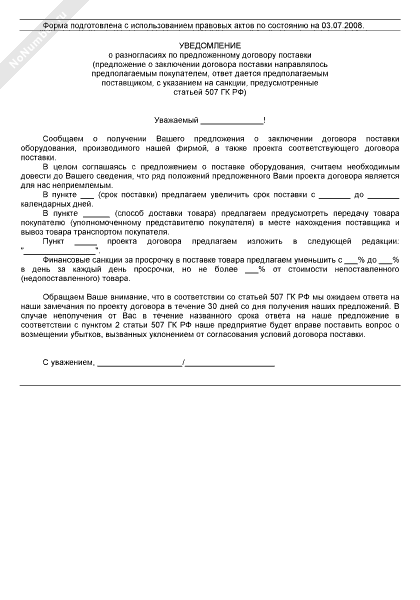 Уведомление о разногласиях по предложенному договору поставки